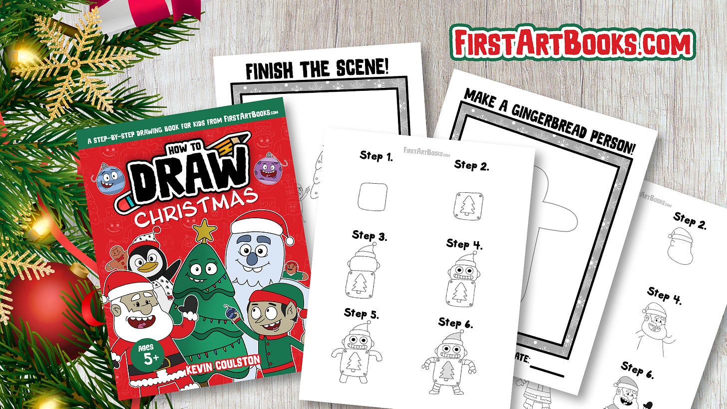 These Christmas books are part of my larger Art Books for Kids series, which now includes more than 80 titles across multiple drawing styles. There are books for unicorns, dinosaurs, monsters, robots, aliens, food characters, animals, people, holidays, and much more.
