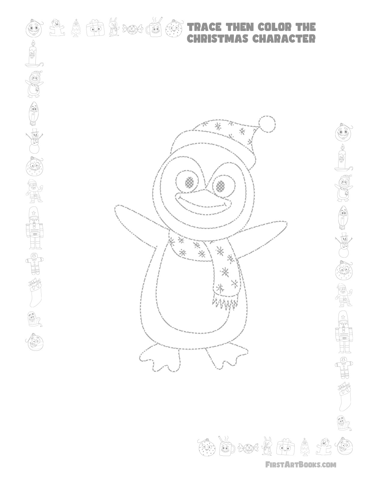 This Christmas Penguin Coloring Page is taken from Trace Then Color: Cartoon Christmas Characters, a book designed to give kids a festive way to explore creativity during the holiday season. Inside, children will find a variety of Christmas-themed characters to trace and color, all drawn in a cute cartoon style that keeps the art approachable and fun.