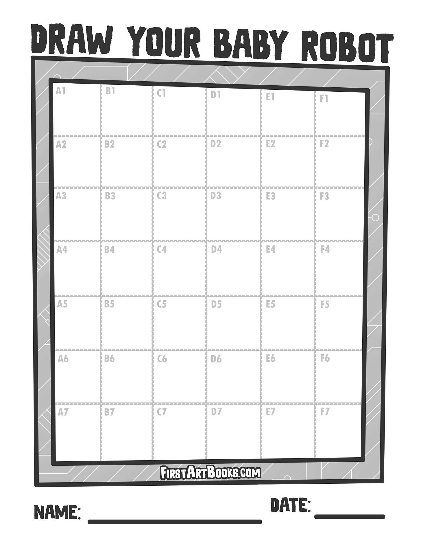 The free page from Draw by Grid: Baby Robots uses a simple grid system that guides kids through the drawing process. The original drawing is shown on a grid, and kids recreate it square by square on their own blank grid.