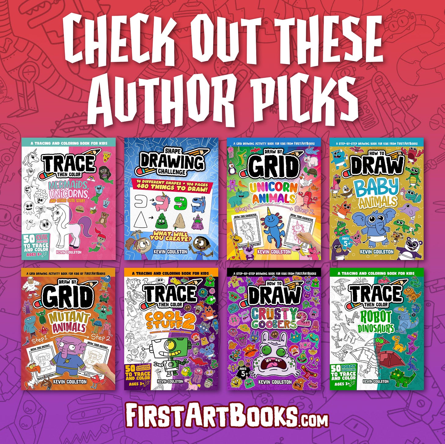 Kevin Coulston is an accomplished cartoonist, animator, and writer. He is the author and illustrator of over 80 (and still counting) children’s drawing books available here on FirstArtBooks.com. Kevin has also authored numerous kid-friendly comic book series, including “Dylan McVillain: A Super Villain with the Best Intentions” and “The Adventures of a 4th Grade Space Captain,” along with the Children’s Picture Book series “Alexis and the T-Rexes.”