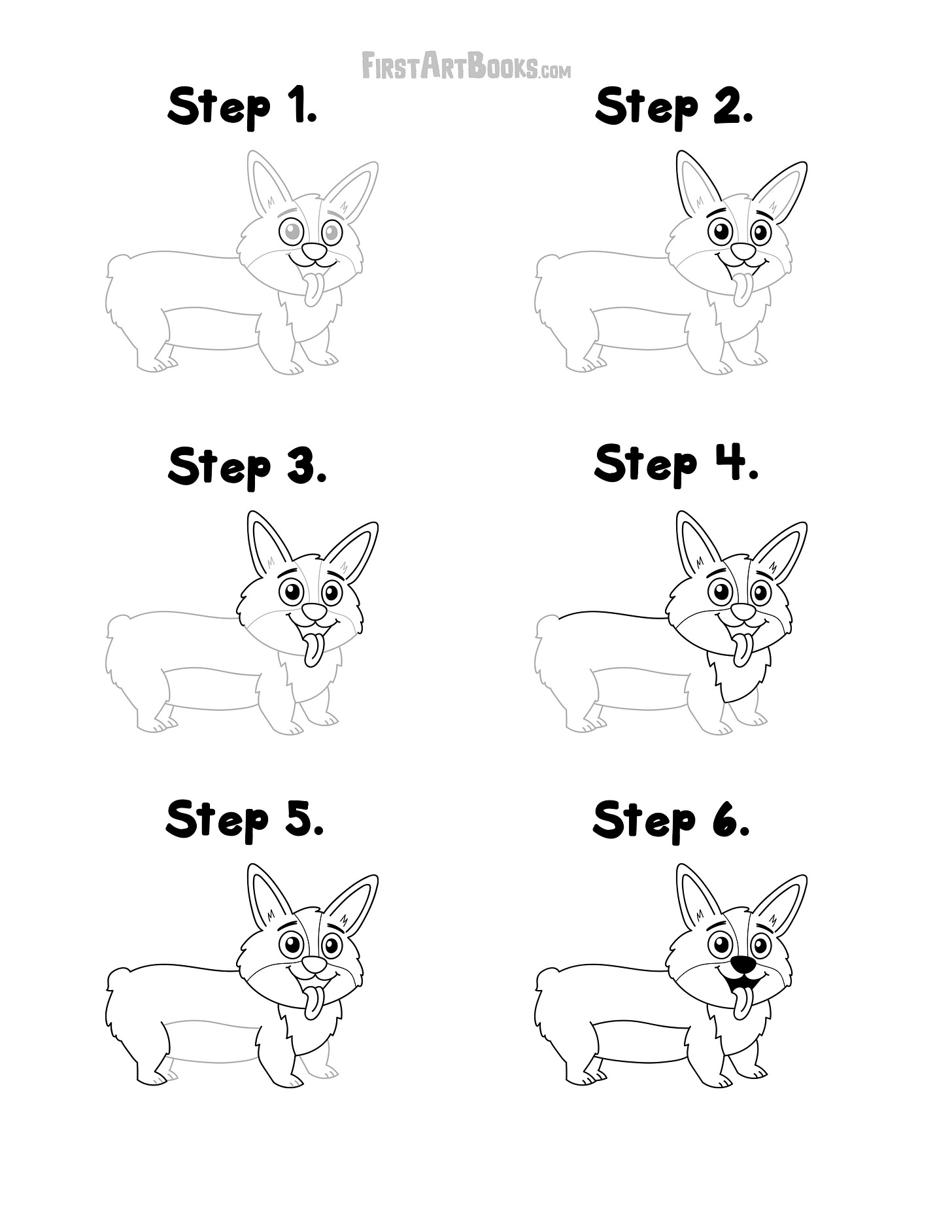 How to Draw: Cartoon Cats & Dogs is designed to help kids learn how to draw animal characters step by step using a consistent, easy-to-follow format. Every character in the book is broken down into six steps, just like the corgi on this free page.