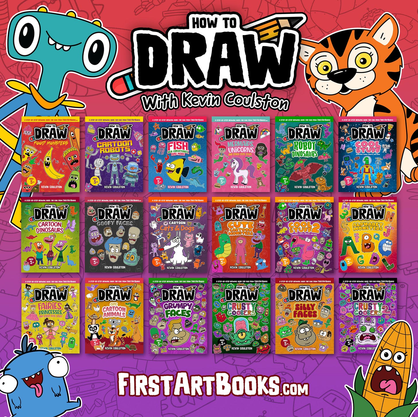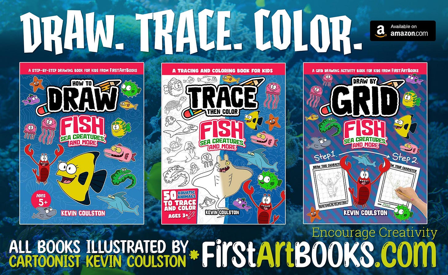 Kevin Coulston is an accomplished cartoonist, animator, and writer. He is the author and illustrator of over 80 (and still counting) children’s drawing books available here on FirstArtBooks.com. Kevin has also authored numerous kid-friendly comic book series, including “Dylan McVillain: A Super Villain with the Best Intentions” and “The Adventures of a 4th Grade Space Captain,” along with the Children’s Picture Book series “Alexis and the T-Rexes.”