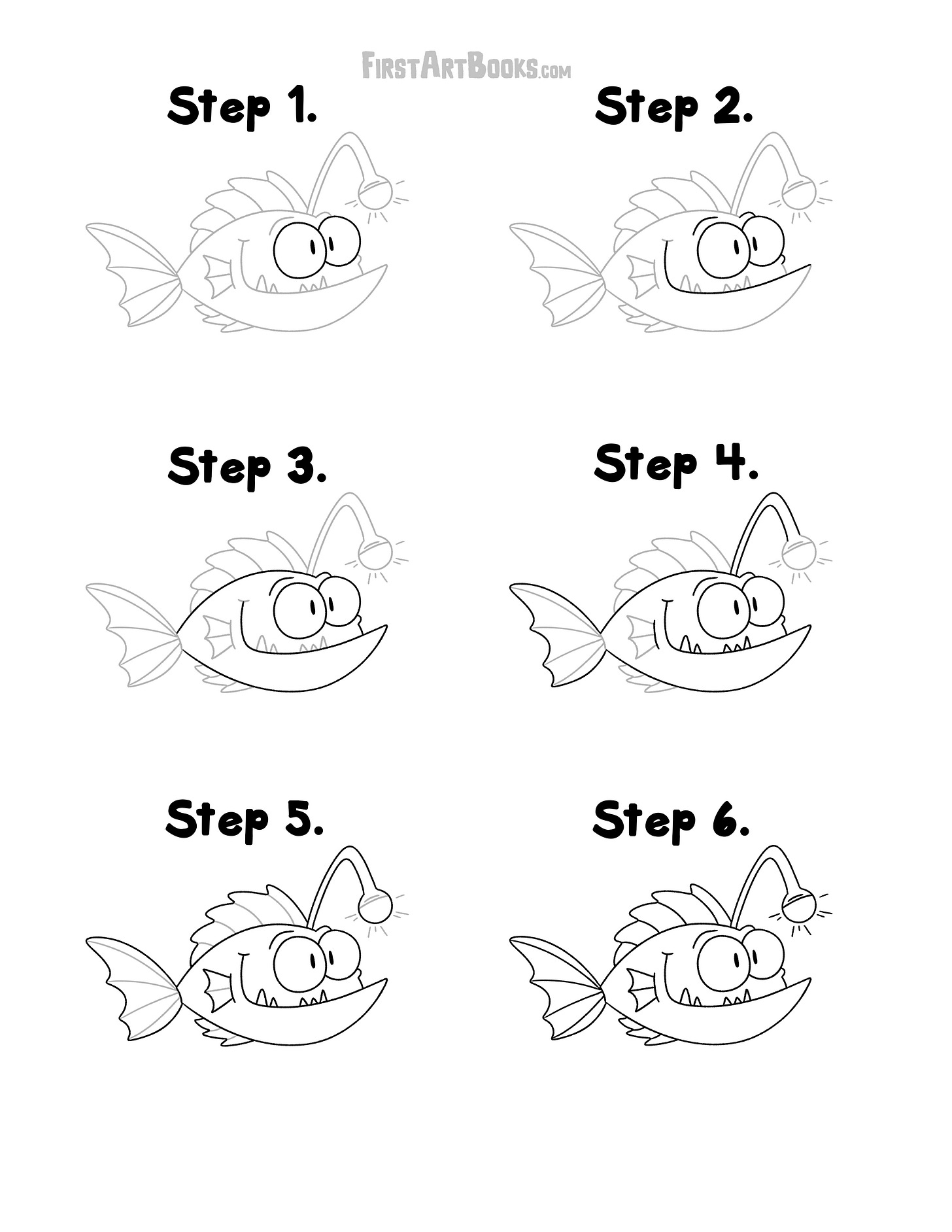 This free page walks young artists through How to Draw an Anglerfish using the same six-step drawing format found throughout the book. Each step builds on the last, starting simple and gradually adding details until the full character comes together.