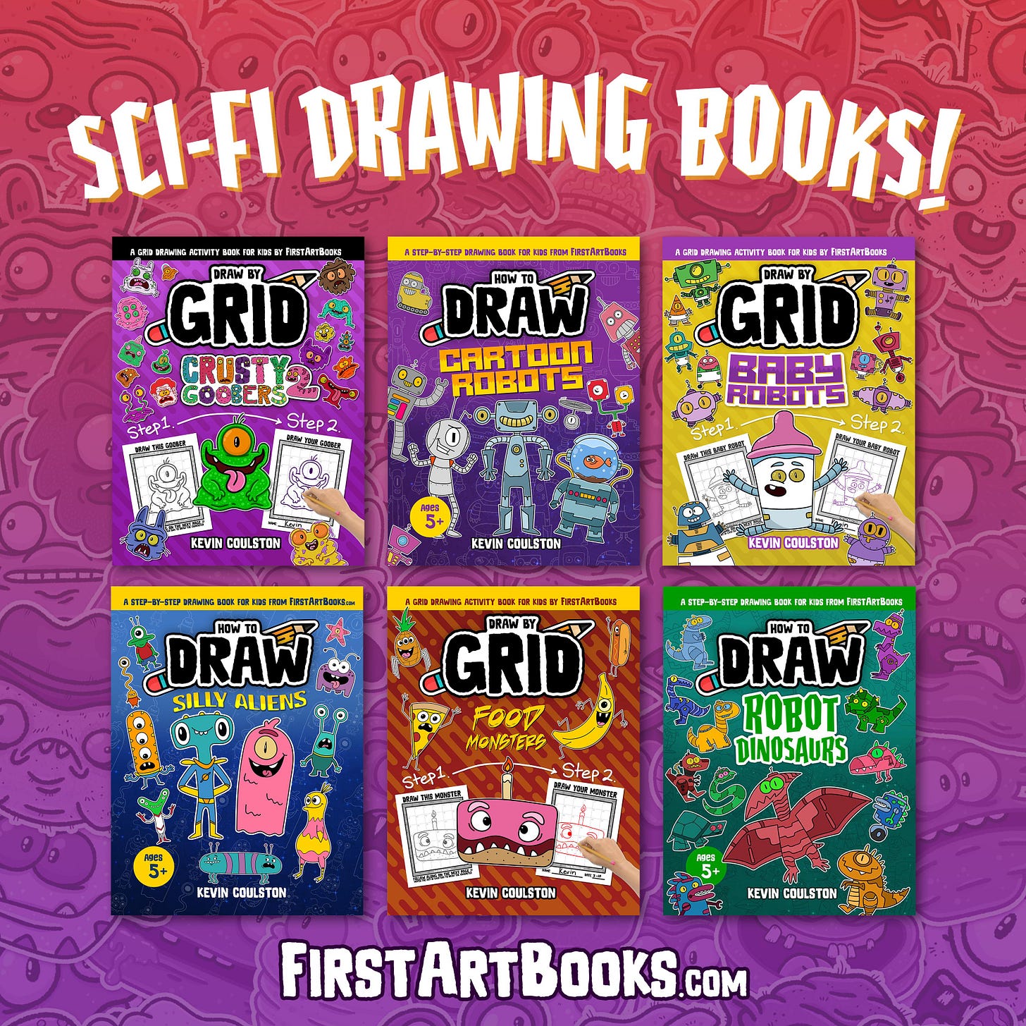 Kevin Coulston is an accomplished cartoonist, animator, and writer. He is the author and illustrator of over 80 (and still counting) children’s drawing books available here on FirstArtBooks.com. Kevin has also authored numerous kid-friendly comic book series, including “Dylan McVillain: A Super Villain with the Best Intentions” and “The Adventures of a 4th Grade Space Captain,” along with the Children’s Picture Book series “Alexis and the T-Rexes.”